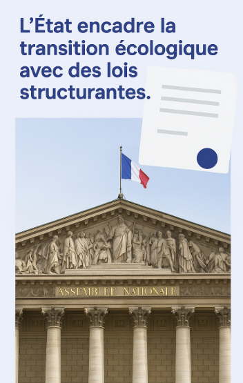 L’action de l’État commence par l’élaboration de lois et de réglementations claires pour guider la transition écologique. Par exemple, en France, plusieurs textes structurants ont été adoptés ces dernières années, comme :